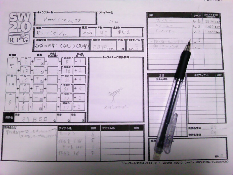 TRPG、ソードワールド2.0のキャラクターシート晒すぜ!