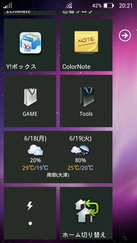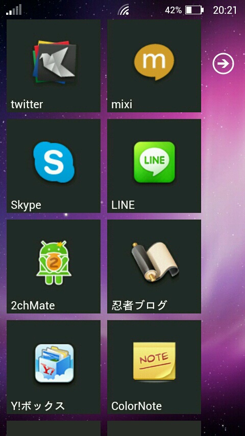 このホームアプリにはフォルダー機能が無いので、「SiMi Folder」というアプリを使って模擬フォルダーを置いてます。