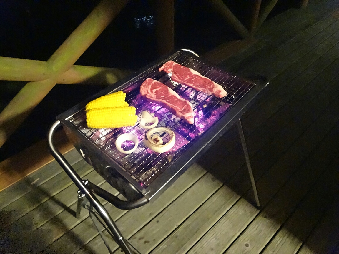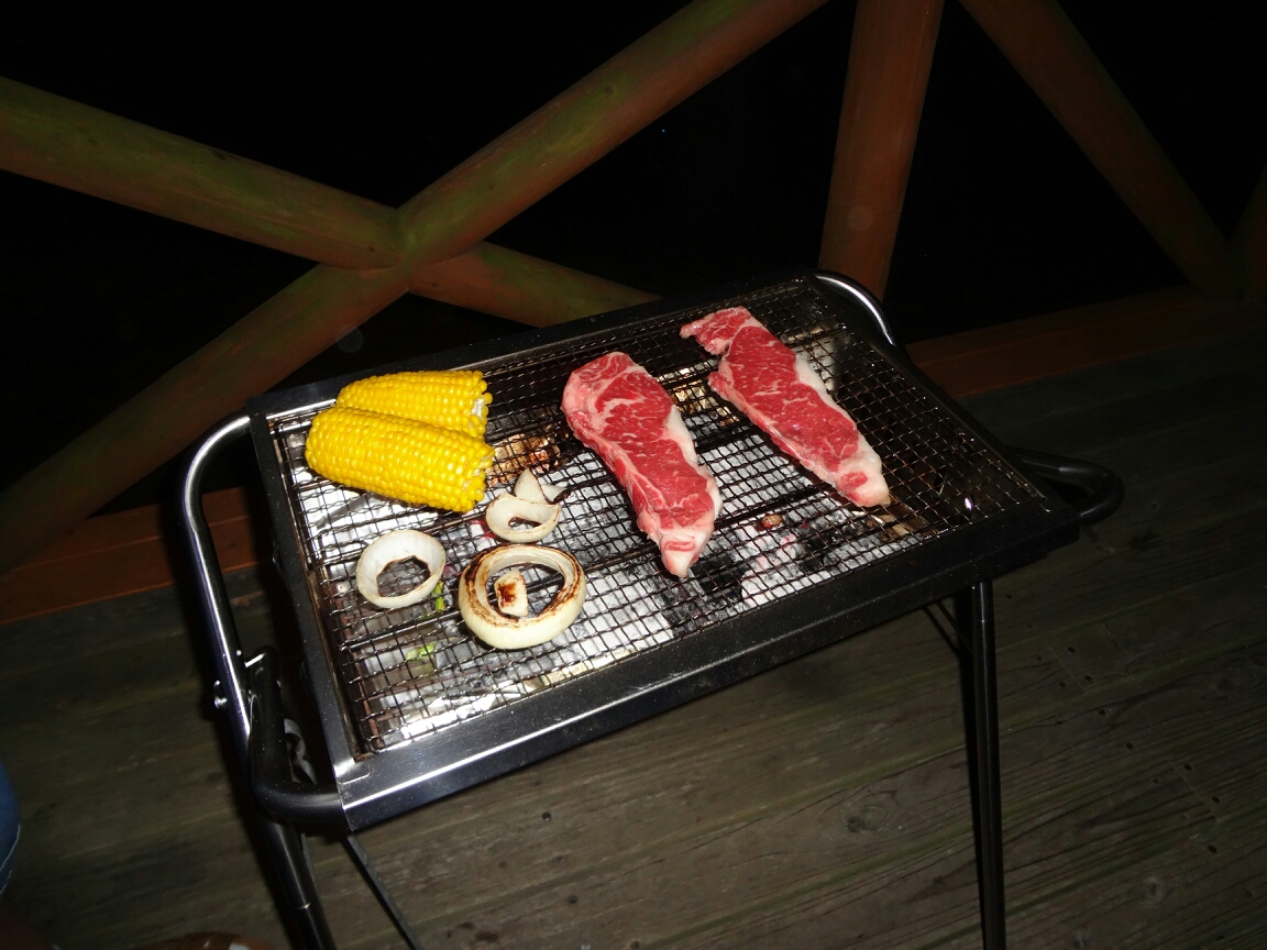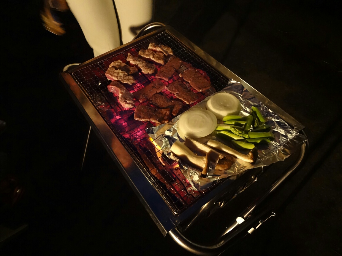 急いで屋根のある所に移動して残った肉や野菜を全部焼くことに。