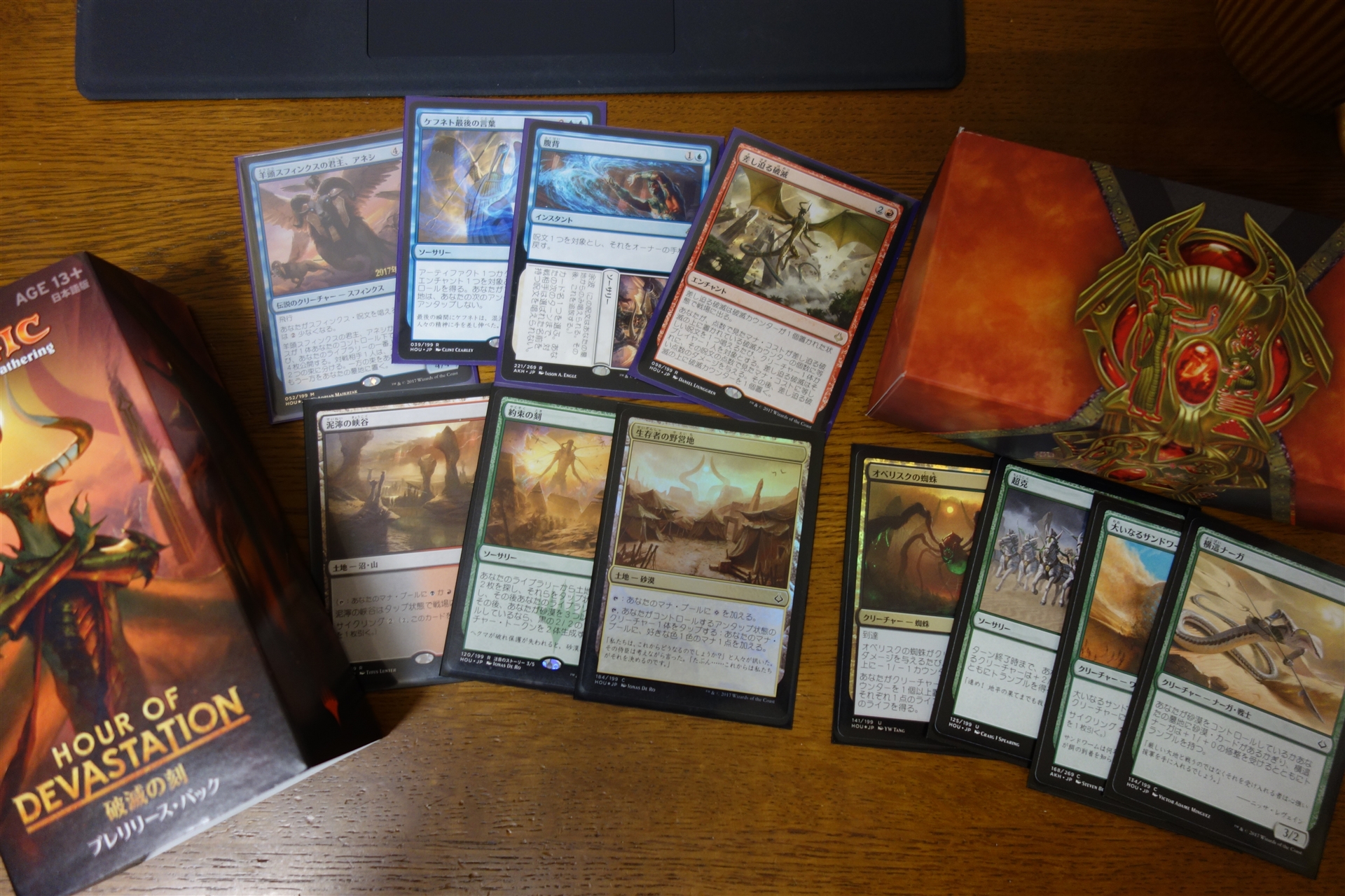日付入りレアは「羊頭スフィンクスの君主、アネシ」でした。…が、リミテッドだと相方のスフィンクスが無く、ただの6マナ4/4飛行だったので見送り。